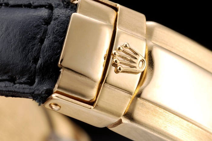 Crown: 18k gult guld cutwork krona med Rolex logotyp och två mindre cutwork tryckknapp kronor på ömse sidor om it