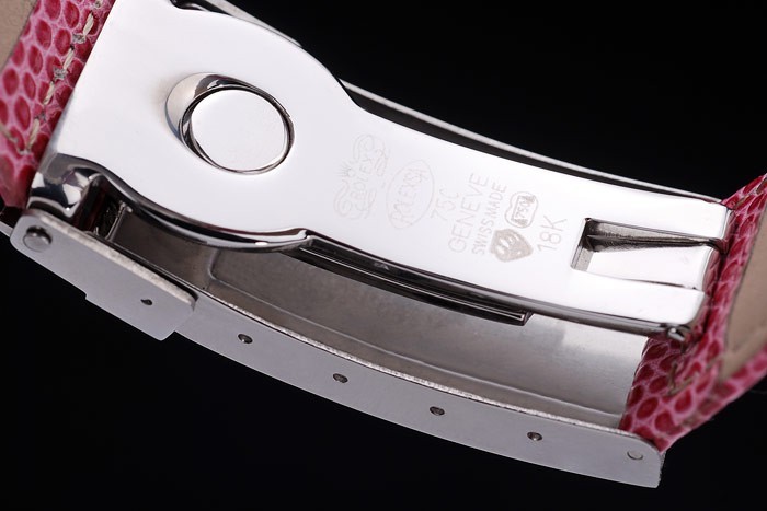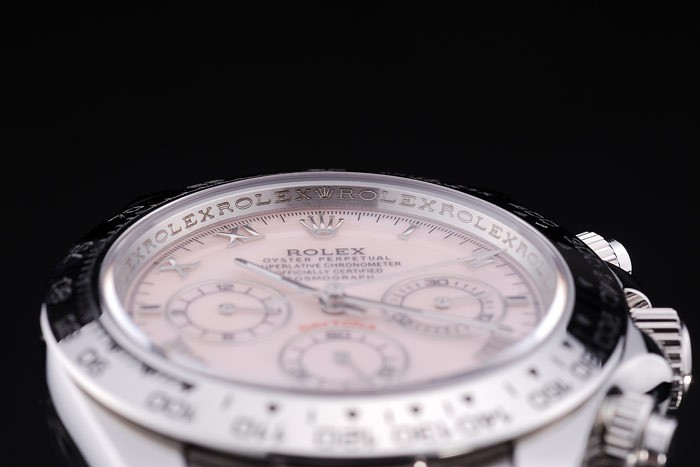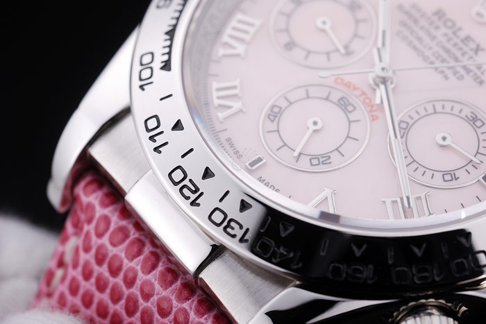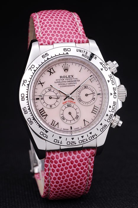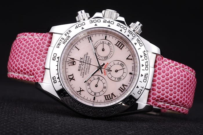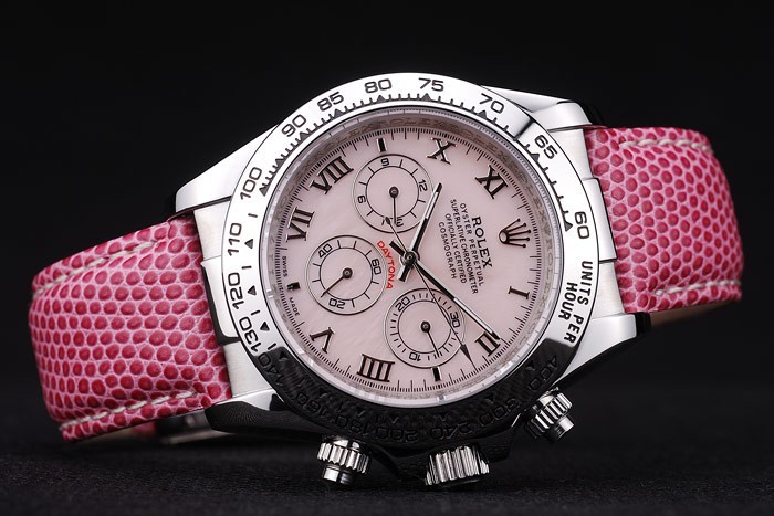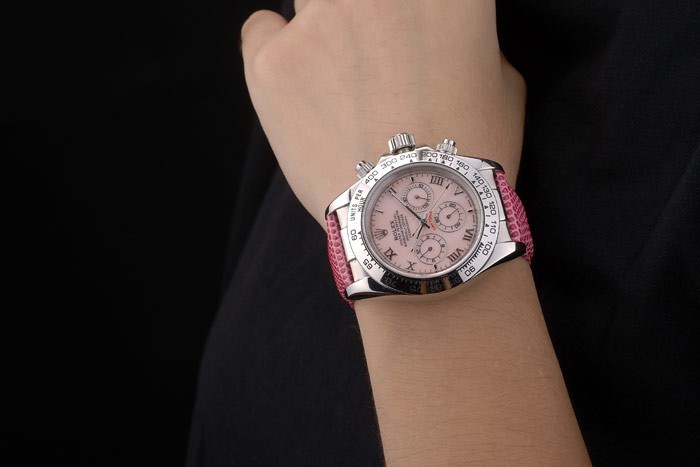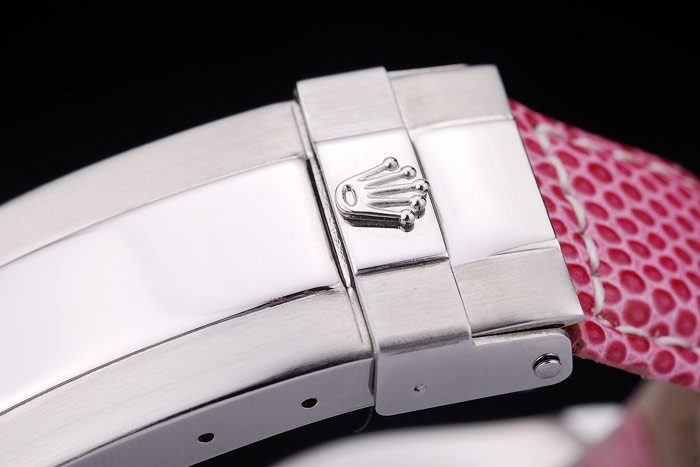 Bracelet: Rosa orm läderrem med Rolex och logotyp gravyr och rostfritt stål utbyggnad lås visar Rolex logo
