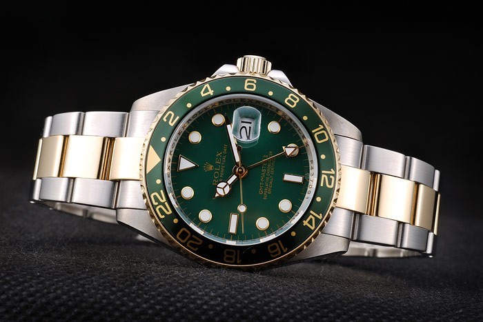 Bezel: Grön keramik cutwork bezel med guld index och arabisk siffra minut markers