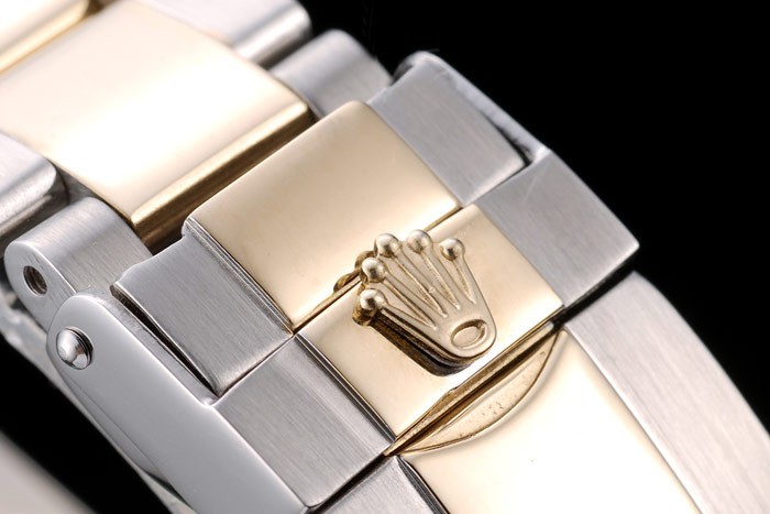 Bracelet: Gul guldpläterad och borstat rostfritt stål länk armband med graverad utbyggnad lås med Rolex logotyp på top
