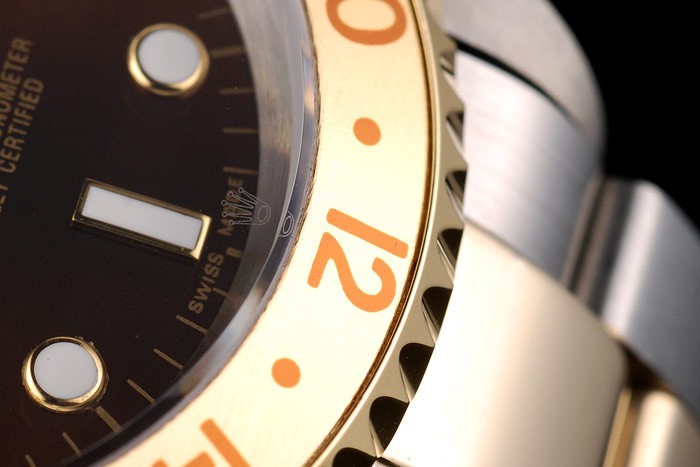 Bezel: guld och orange keramiska cutwork bezel med 24-timmars markörer i arabiska numerals