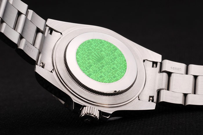 Back: Tryck in rostfritt stål tillbaka med grön Rolex klistermärke och markings